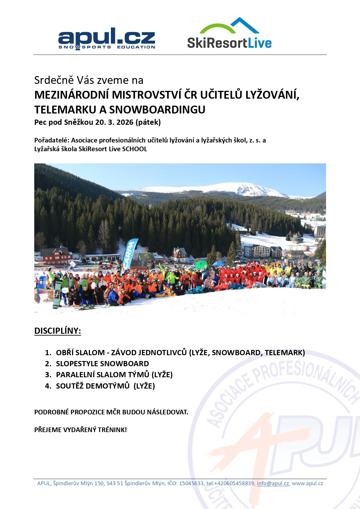 DALŠÍ ROČNÍK MČR APUL UŽ SE BLÍŽÍ. TENTOKRÁT SE NA TUTO AKCI, JEŽ JE PRO MNOHÉ VČETNĚ NÁS SAMOTNÝCH VRCHOLEM SEZÓNY, CHYSTAJÍ V PECI POD SNĚŽKOU. SJEZDOVKA JAVOR SE STANE SVĚDKEM ZÁVODU V OBŘÍM SLALOMU, SLOPESTYLU A DALŠÍCH DICIPLÍNÁCH, JEJICHŽ POMYSLNÝM VRCHOLEM BUDE TRADIČNĚ DISCIPLÍNA DEMO.