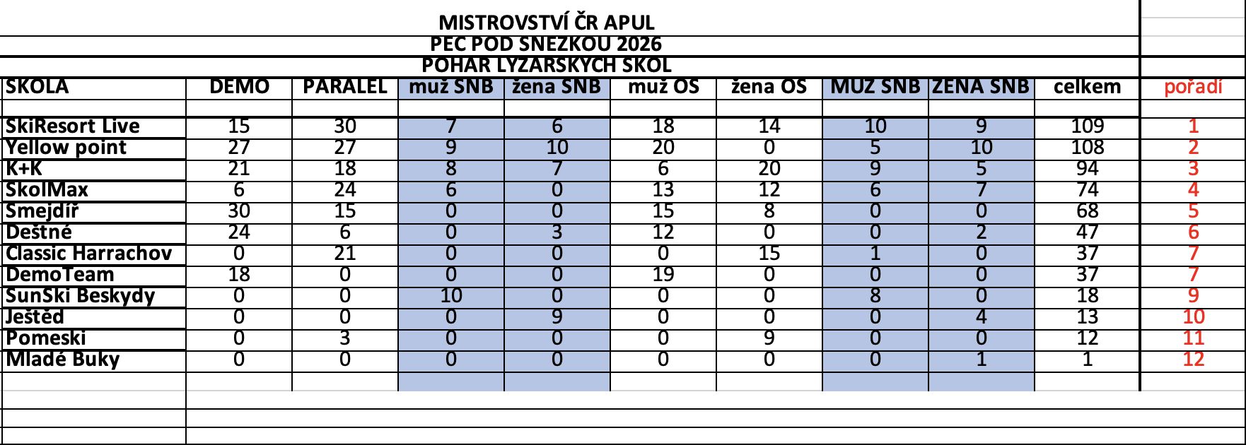 DALŠÍ POVEDENÝ ROČNÍK MČR APUL JE ZA NÁMI. 20. BŘEZNA 2026 SE V PECI POD SNĚŽKOU SEŠLO 12 LYŽAŘSKÝCH ŠKOL A CCA 160 INSTRUKTORŮ A INSTRUKTOREK, ABY VZÁJMNĚ POMĚŘILI SÍLY. VYHRÁLI TI NEJLEPŠÍ. V PRESTIŽNÍM POHÁRU LYŽAŘSKÝCH ŠKOL LETOS NEJVÍC BODŮ ZÍSKALA DOMÁCÍ LYŽAŘSKÁ ŠKOLA SKIRESORT LIVE.